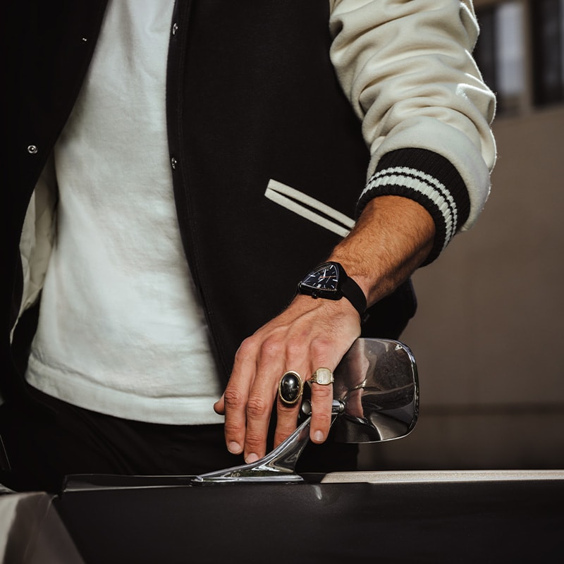 Die Ventura war nicht nur die erste elektrische Uhr der Welt. Ihre dreieckige Form verwies zusätzlich auf die an Raumschiffe erinnernden Heckflossen, die die extravaganten amerikanischen Autos der Zeit schmückten. Die dreieckige Uhr wurde zu einem wahrhaft ikonischen Designelement von Hamilton, das perfekt mit Presleys aussergewöhnlich grosszügigem Lifestyle und seinen charakteristischen Looks verschmolz.