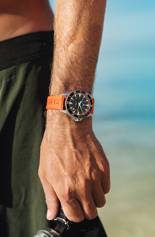 Die Khaki Navy Scuba ist im Wasser und in Tiefen von bis zu 100 Metern ein zuverlässiger Begleiter, der auch an Land eine ebenso funktionale wie stilvolle Figur macht.