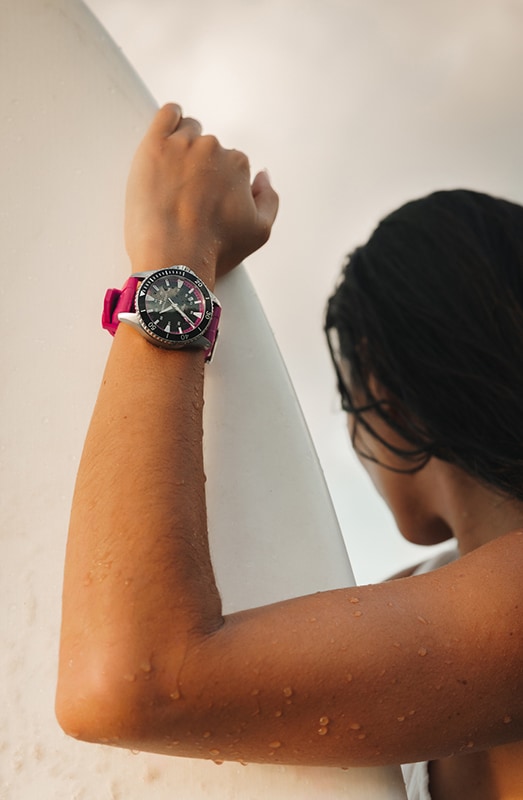 Die bis zu einem Druck von 100 bar (1.000 m) wasserdichte und mit einem Heliumventil ausgestattete Uhr ist vom U-Boot-Design inspiriert und eignet sich perfekt für Ihr nächstes Abenteuer im Wasser.