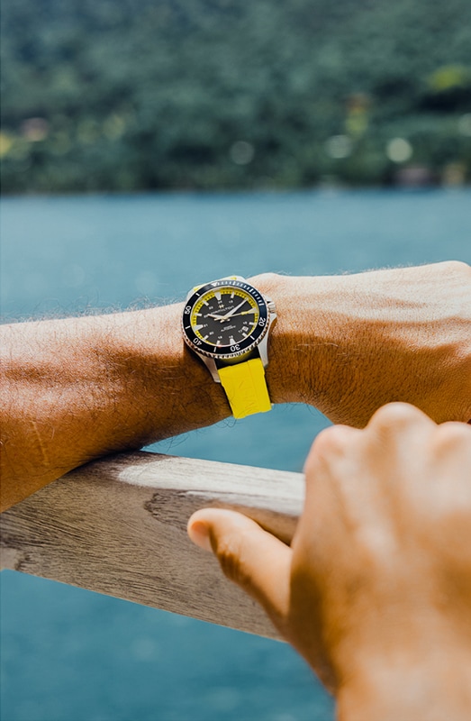 Das leuchtende Gelb des Kautschukarmbands und der Zeiger steht für ein neues Kapitel in Sachen Stil und Funktion für diesen Tiefsee-Favoriten.