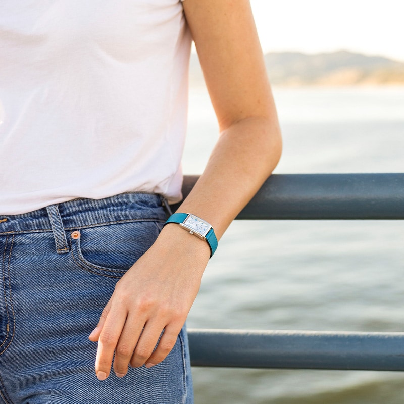 Now available with either a cool turquoise or sunny coral leather strap, this American Classic demands a second look with matching-in-color Roman numerals and an angular stainless steel case. Whether it’s shining against an all-neutral ensemble or blending into a brightly colored look, the Ardmore is a wristwatch with a fun and unique character you can wear all year long.