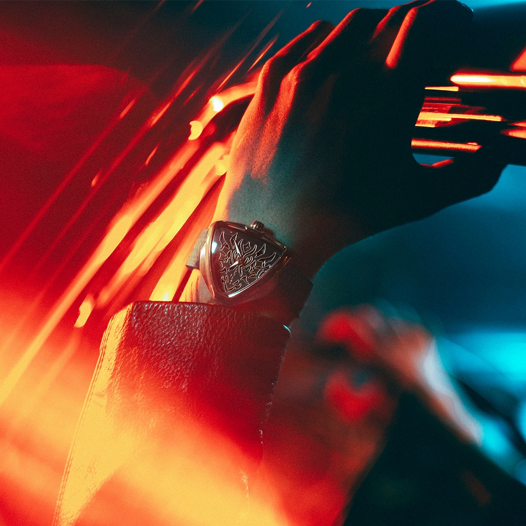 The striking cutaways on the dial reveal a dragon’s face full of power and courage. The dragon’s face is 90° clockwise on the dial, which perfectly fits the Ventura's iconic and avant-garde, geometric shield shape.