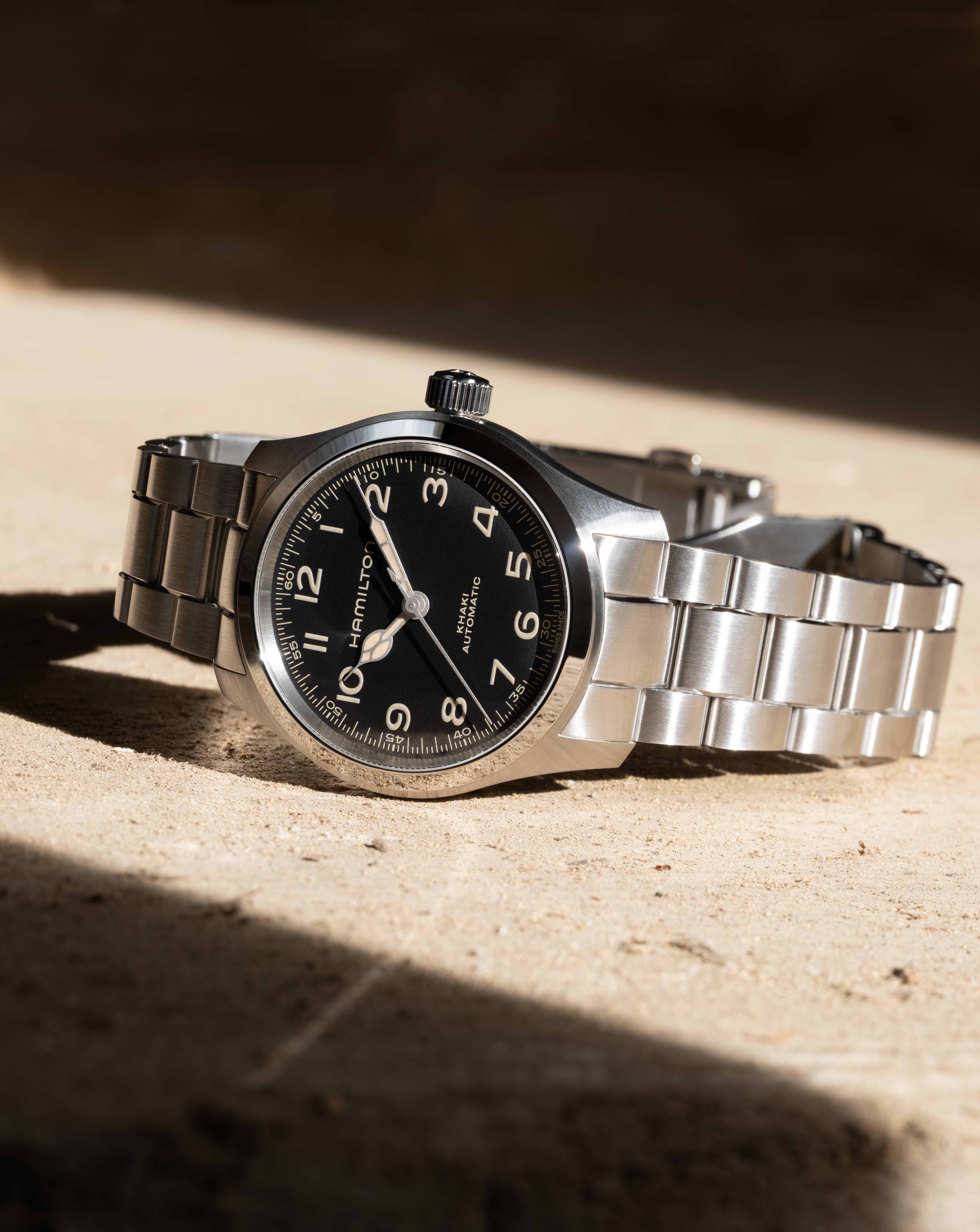 映画ファンの間で「マーフウォッチ」の愛称で親しまれている最も有名なSFウォッチ「カーキ フィールド マーフ」。ヴィンテージ感を漂わせるベージュのアラビアインデックスや印象的な針の形状は、オン・オフの両方で活躍するパートナーとして心地の良いデザインです。38㎜径のブレスレットタイプは、汎用性に優れ、スタイリッシュ。ハミルトンの遊び心とユニークネスが詰まった1本が、ふたりの物語を紡ぎます。