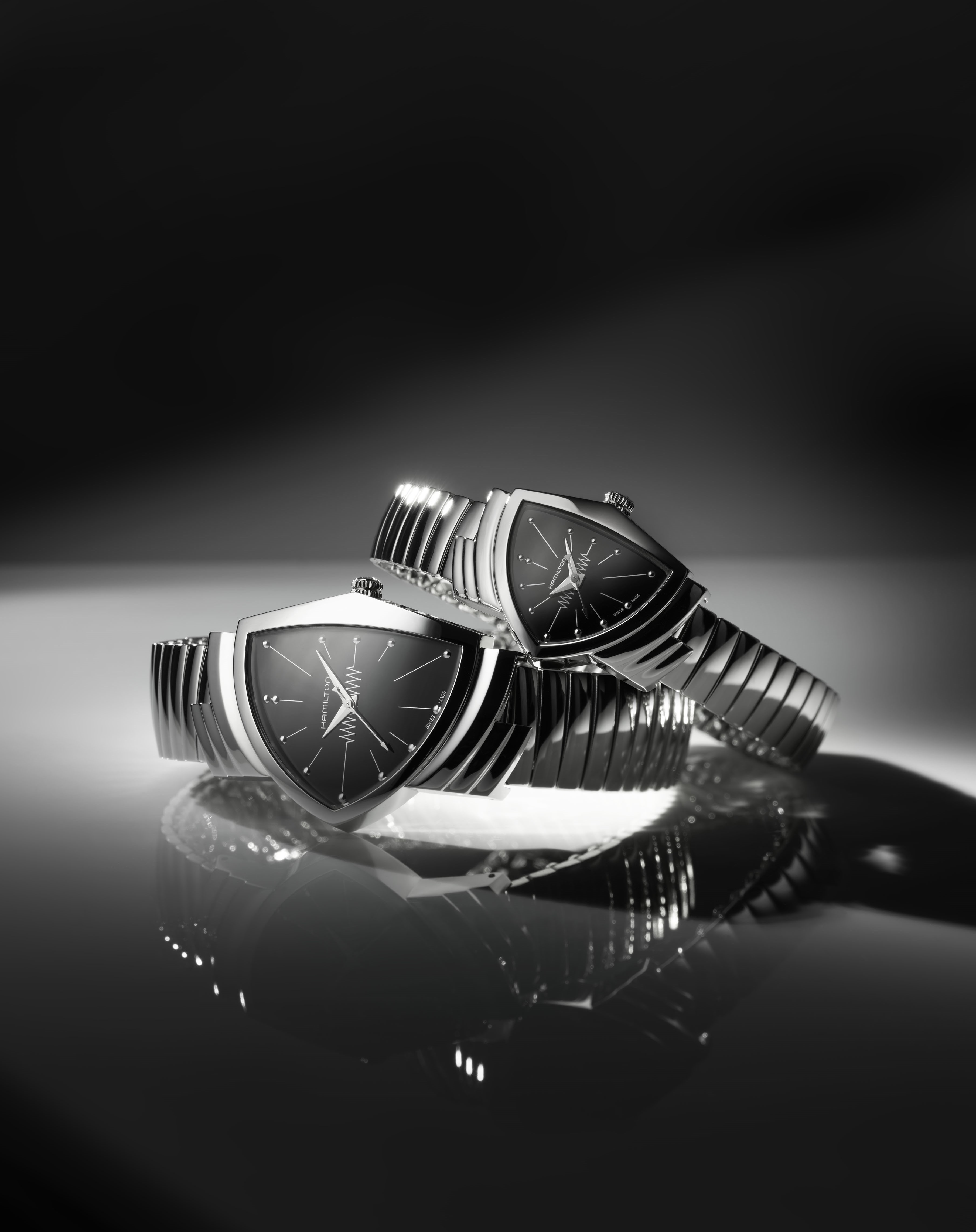 1957年に発売された「ベンチュラ」は、世界初の電池式腕時計として時計史に革命を起こしました。革新的で大胆なデザインを備え、ハミルトンのアイコンウォッチとして不動の人気を誇ります。20世紀半ばのアメリカのモダンデザインを色濃く反映したスタイリッシュなフレックスベルトを採用した「ベンチュラ」は、おしゃれなふたりにぴったりです。