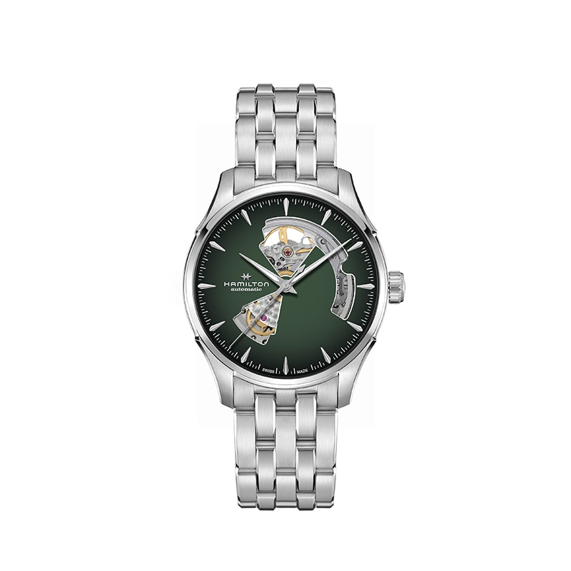 Рассмотрите работу механизма часов Jazzmaster Open Heart в корпусе 40 мм. Дизайн часов с эффектом градиента на зеленом или темно-синем циферблате идеально сочетается с высококачественным кожаным ремешком или браслетом из нержавеющей стали.