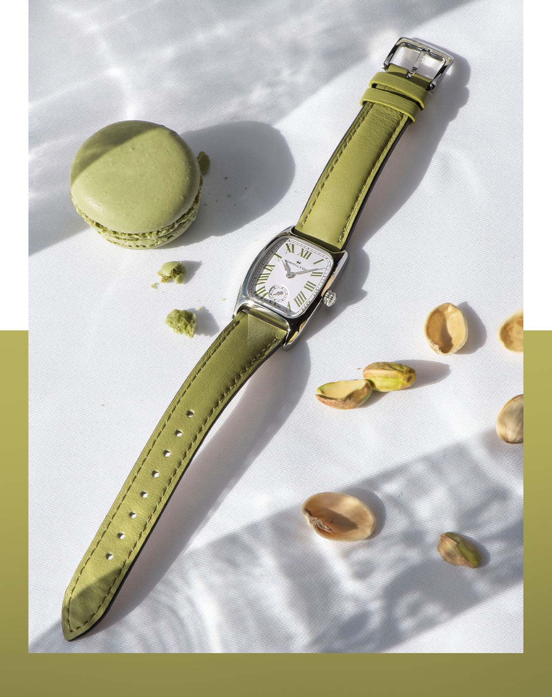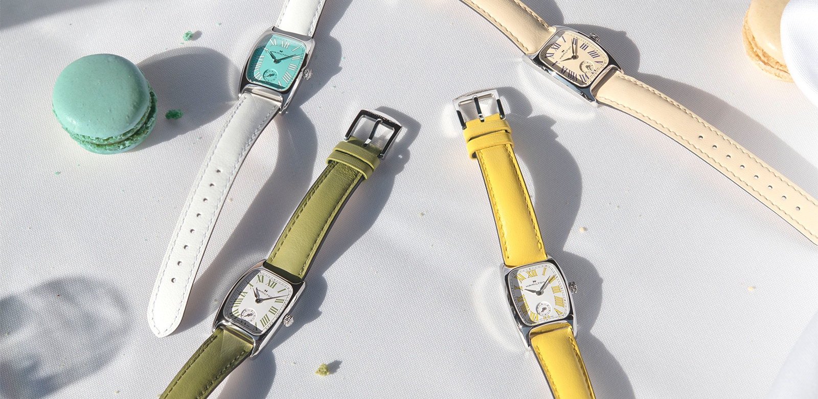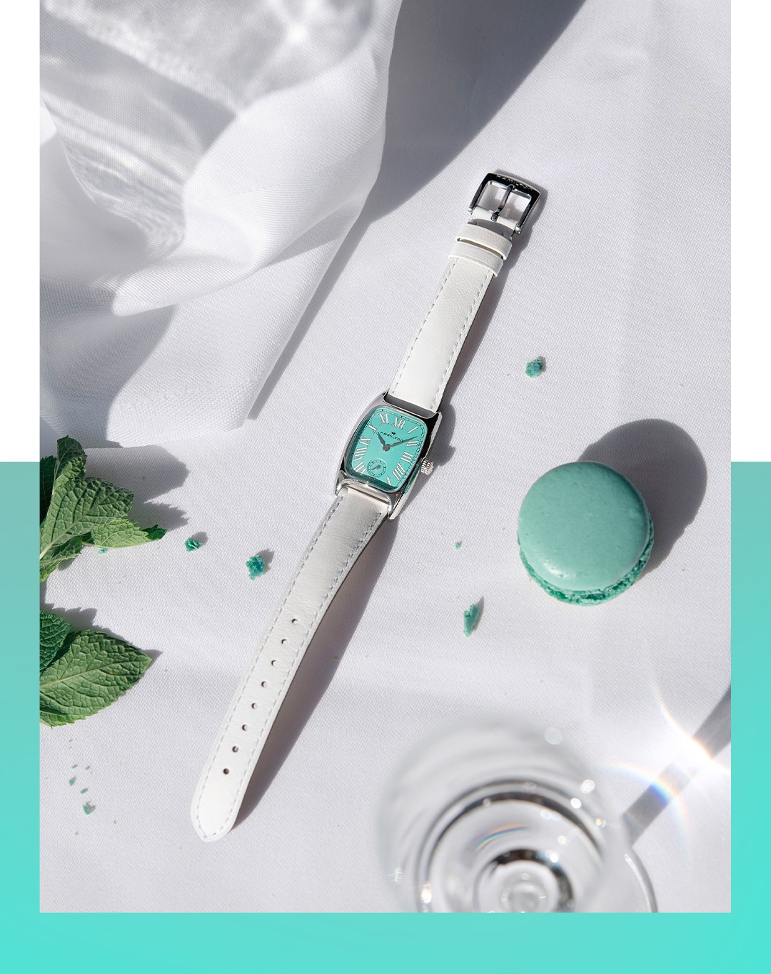 The Hamilton Boulton is reimagined in four vibrant hues, each inspired by a beloved flavor of macaron and infusing the distinctive 1940s timepiece with a feminine aesthetic that is both fresh and timeless.