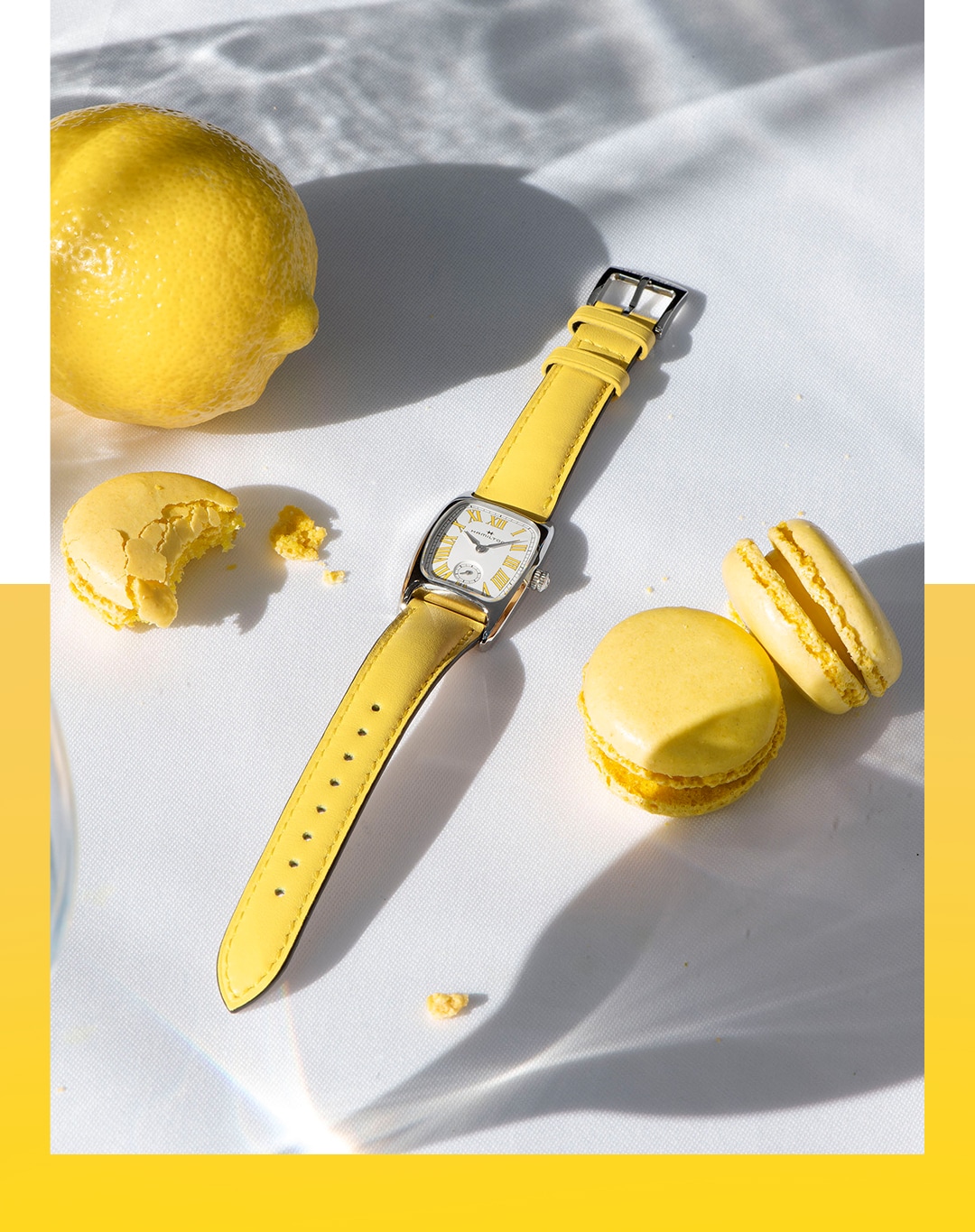 The stunning pearl white dial of this watch is adorned with vibrant lemon yellow numerals, resulting in a striking contrast. The yellow strap adds a pop of color, making it a bold and eye-catching accessory. This timepiece is sure to make a statement and brighten up any outfit.